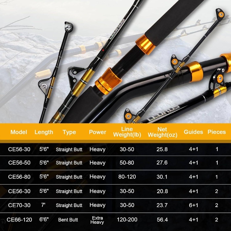 1Piece/2Piece Saltwater Offshore Heavy Trolling Rod for Big Game Fishing, Conventional Boat Fishing Pole measuring 5 Feet 6 Inches, with weight capacities of 3050 lb, 5080 lb, and 80120 lb.