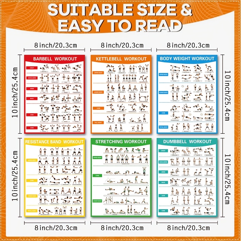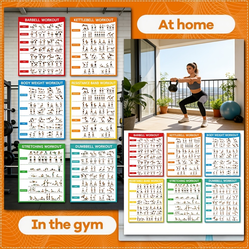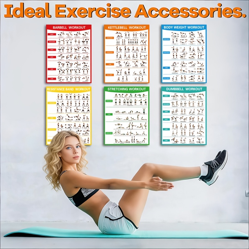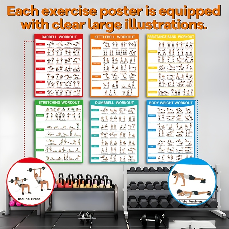 6pcs Fitness Poster Set | Stretching, Weight Training, Dumbbells, Yoga, Stabilit