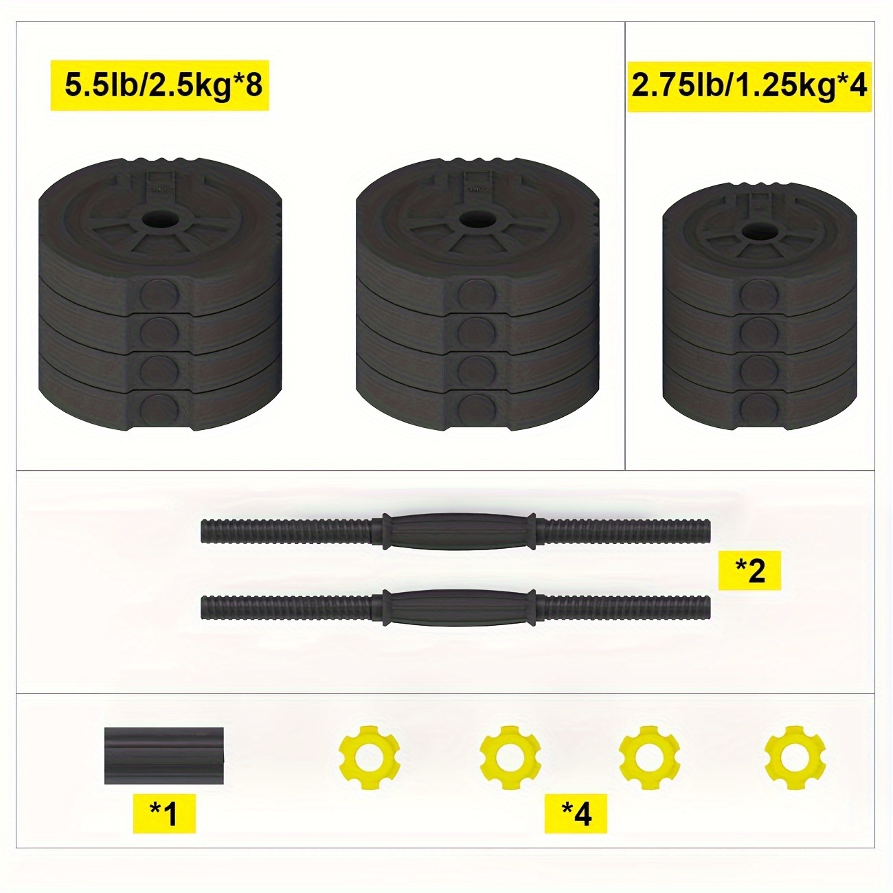 WHAT YOU GET: The package of our dumbbells set includes 4x4.4lbs Dumbbell plates, 8x5.5lbs Dumbbell plates, 4x dumbbell nuts, 2x dumbbell bars and 1x connertor.You can choose different weights according to your preference to meet the intensity needs of you and your family at different stages of exercise.